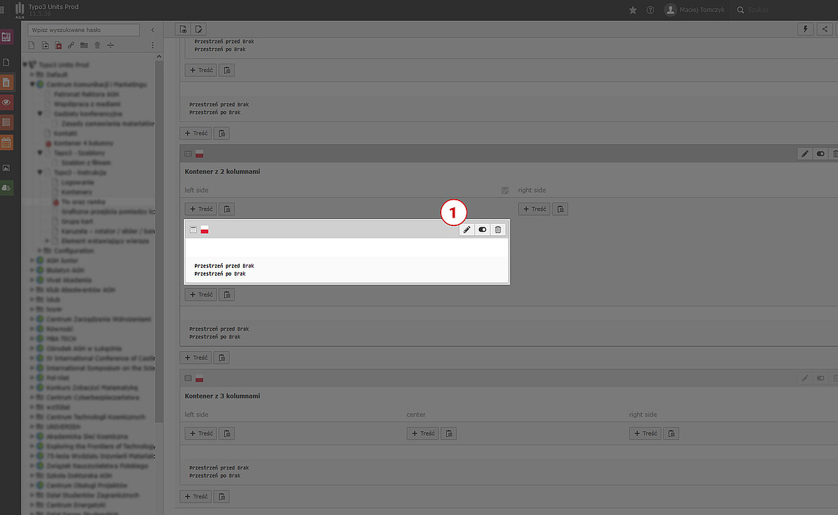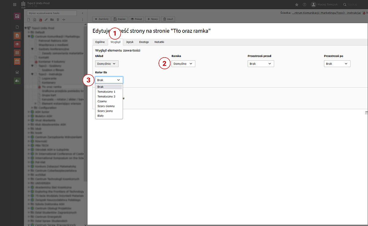 Dobór koloru elementu zawartości możliwy jest poprzez edycję elementu zawartości na karcie „Wygląd” i wybranie wariantu kolorystycznego z rolety. W przypadku braku wyświetlania ramki (opcja „Domyślna”) nie ma możliwości wyboru koloru tła. Kolor będzie wtedy powiązany z kolorem tła kontenera w jakim znajduje się edytowany element lub kolorem tła będzie biały jeżeli element nie znajduje się w żadnym kontenerze. Więcej informacji nt ramki elementów zawartości