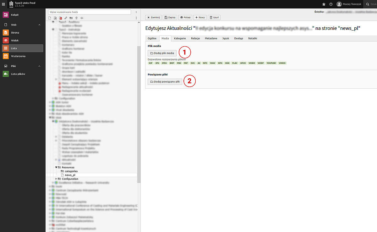 Karta „Media” pozwala dodać do aktualności grafikę oraz listę plików do pobrania.