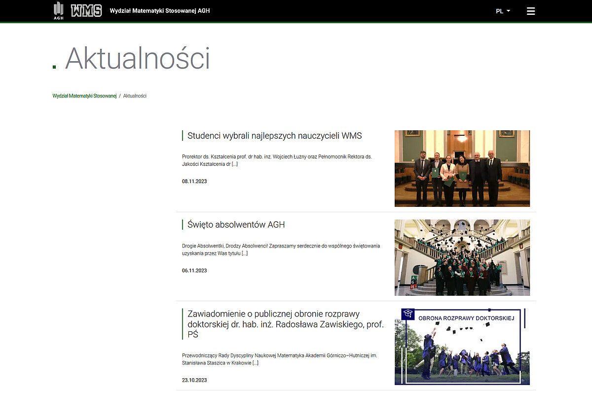 Domyślna lista aktualności znajduje się na dedykowanej podstronie serwisu. W miarę powstawania kolejnych pozycji lista automatycznie stworzy u dołu strony tzw paginację czyli element pozwalający przechodzić do starszych aktualności.
