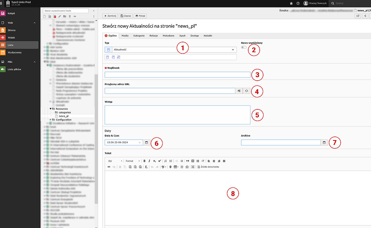 Pierwsza karta edycji aktualności posiada kilka pól dialogowych wpływających na ostateczny kształt aktualności: