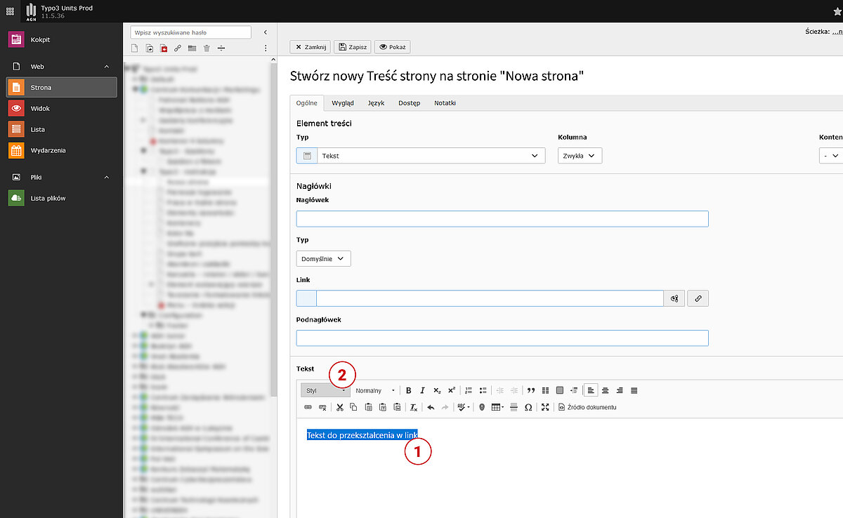 Chcąc stworzyć link tekstowy należy wykorzystać elementu zawartości dysponujący edytorem tekstowym np „Zwykły element tekstowy”, „Tekst i obrazki”, „Tekst i wideo”, itp.